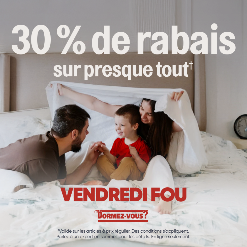 Avec 30 % de rabais sur presque tout chez Dormez-vous, soyez les seuls à ressortir du Vendredi fou vraiment reposés.